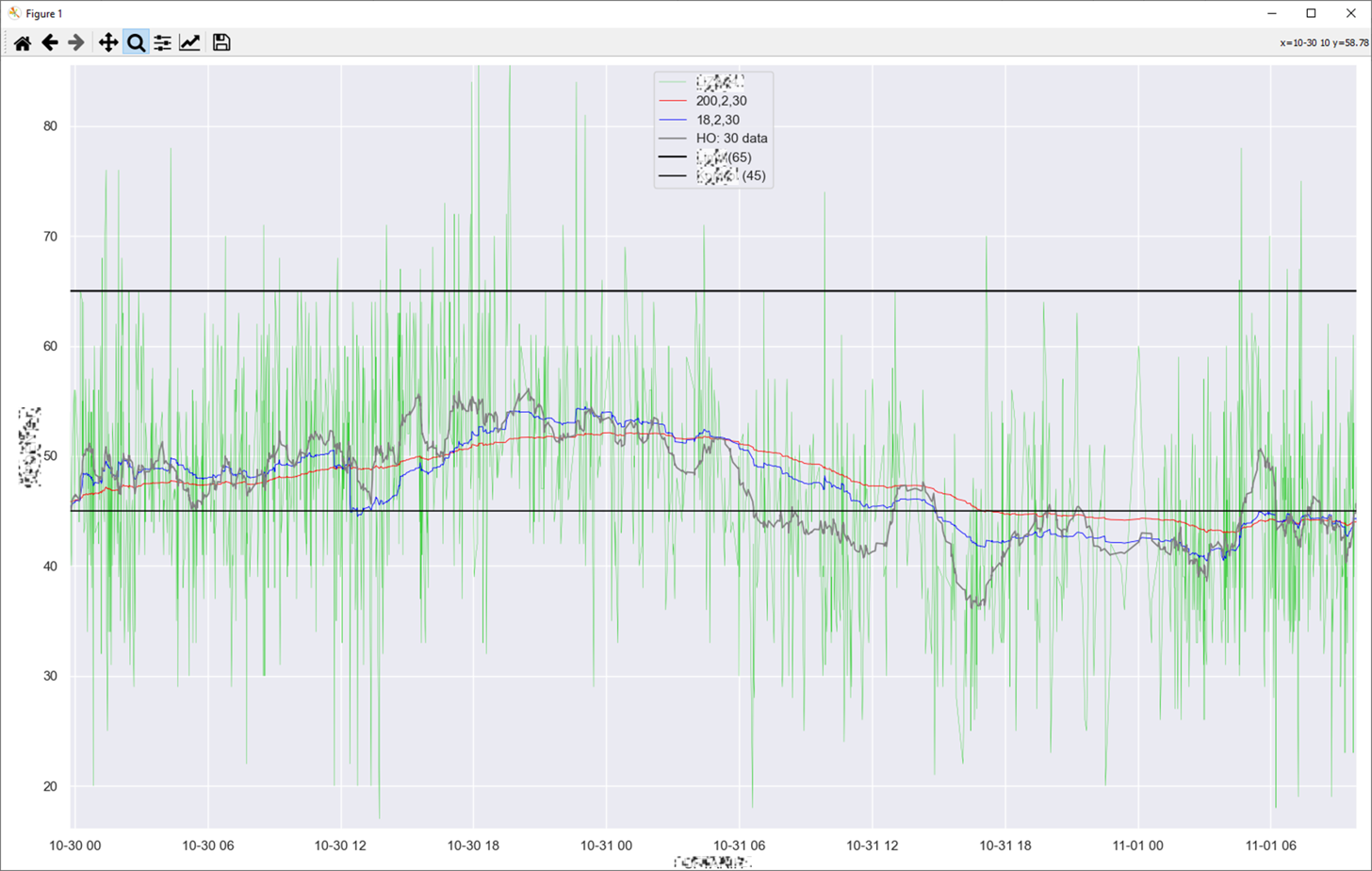 Burada bizim senaryomuza göre Excel üzerine indirdiğimiz ~150bin verinin 200, 2, 30 ve 20, 2, 30 ‘luk KAMA değeri ile 30 datalık Hareketli ortalamasını almak üzere yola çıktık. Excelde istediğimiz kolonun grafiğini hazırlarken, başka kolonlara göre de bazı filtrasyonları da çalıştırmayı denedik. Kod içine ufak notlar aldım, inceleyebilirsiniz. Kodlardan görebildiğiniz üzere benim excelim’de referans olarak tarih, kolon_1 ve kolon_2 kolonları bulunmakta.