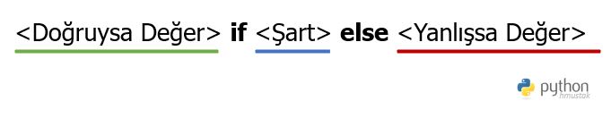 Ternary operatörü, Türkçesi ile 3 kısımdan oluÅŸan operatör programlama dillerinde IF gibi ÅŸarta baÄŸlı durumların kod bloklarında tek satıra indirgenmiÅŸ, pratik versiyonları olarak düşünülebilinir. Sadece Python’da deÄŸil Java, Javascript, C, C++, C#, Ruby, PHP, kotlin gibi dillerde de uygulayabilirsiniz.
