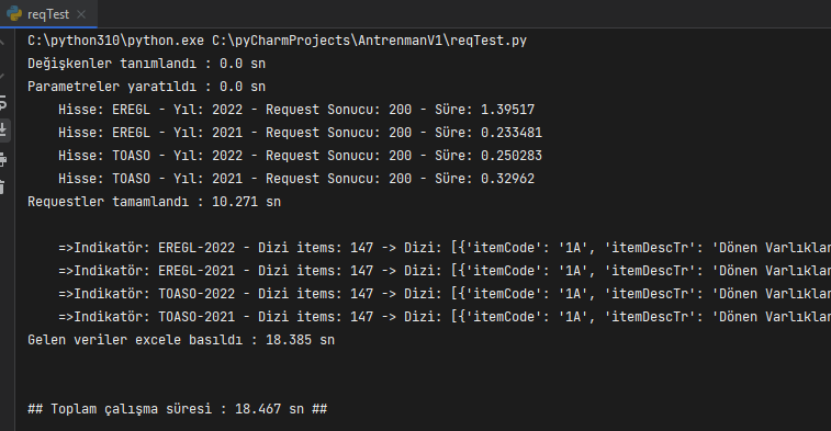 Çalıştırdığınızda aşağıdaki gibi bir ekran görüyor olacaksınız. Bu ekranda hisse senetlerinizi, yıl bazında çekilen dönemlerini, request sonuç dönüş kodunu, ne kadar sürede requestin tamamlandığını ve sonrasında excele aktarılan verilerin temel hallerini göreceksiniz. Unutmayalım ki bu sadece bilgi ekranı, belki sonuçları teyit etmek için de kullanabilirsiniz. Boş ekran görmekten iyidir.