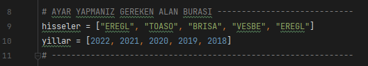 Peki hisse senetlerini ve dönemleri nasıl set edeceğiz. O da gayet kolay. Kod içinde 17 ve 18. satırlarda aşağıdaki gibi bir alan bulunuyor, orayı istediğiniz gibi düzenleyebilirsiniz.