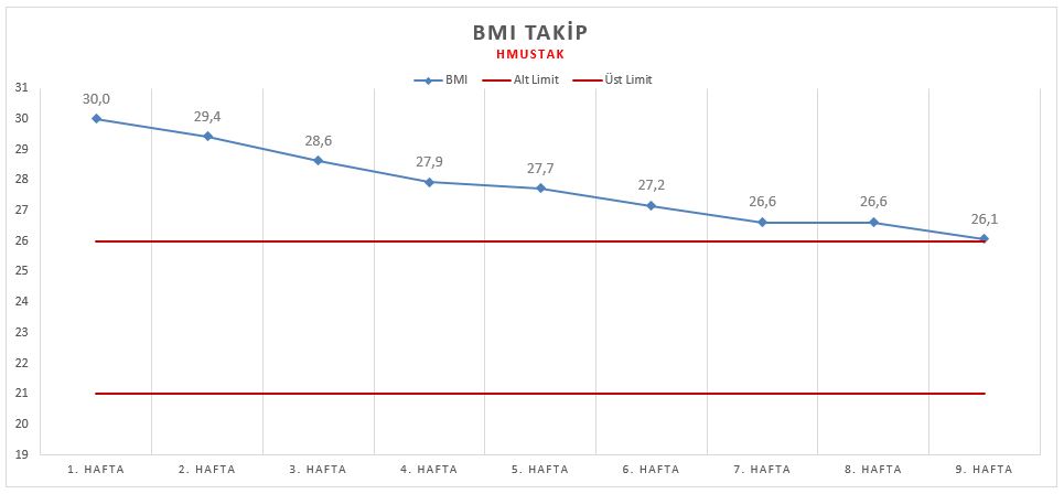 Kişinin boyuna oranla ağırlığının yetersiz olduğunu ifade eden bu değer ile karşılaşılması durumunda kişinin diyetisyen eşliğinde sağlıklı bir şekilde kilo alması önerilir. - 18.5 ila 24.9 bmi : Normal.