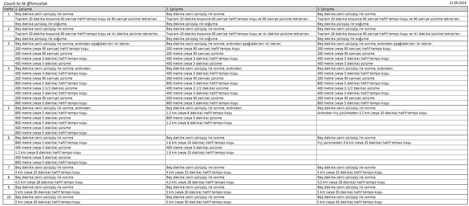 Bu hedef için koşu planlarına bakarken internetin ne kadar çok bilgi kirliliği ile dolu olduğunu tekrar gördüm. O arada http://c25k.com/ adresini görünce aklıma daha önce bu siteye girdiğim ve kendime oradan çeviri ile hazırladığım bir plan olduğunu hatırladım. Aradım ve GoogleDrive dökümanları silinmiş dosyalar arasında tablomu buldum. Onu da paylaşmak istiyorum. Umarım birilerinin hayatına dokunur ve sağlıklı yaşamasına vesile olurum.